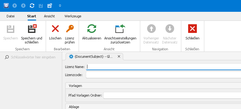 Nach erfolgreichem Login mit einem Administrator, öffnet sich Infodesk direkt in der Ansicht der Globalen Konfiguration. Hier sind Lizenzname und Lizenzcode zu hinterlegen. Alle weiteren Infodesk-Ansichten sind gesperrt: