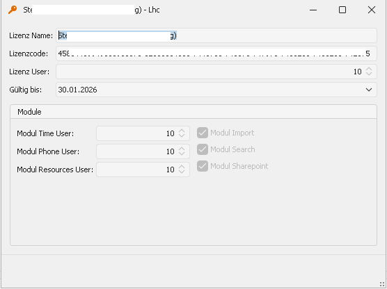 Ein Klick auf diesen Knopf prüft die eingetragene Lizenz auf Validität und zeigt die Details - Lizensierte Benutzer, Gültigkeitsdauer, gebuchte Module - der aktiven Lizenz an.