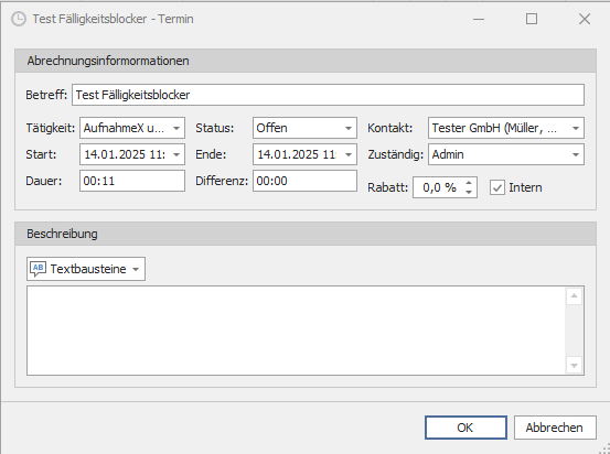 Das Notizfeld erlaubt eine genauere Beschreibung der erbrachten Leistung. Diese Informationen werden auch im Zeitabrechnungsbericht dargestellt.