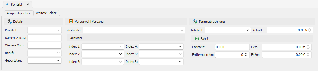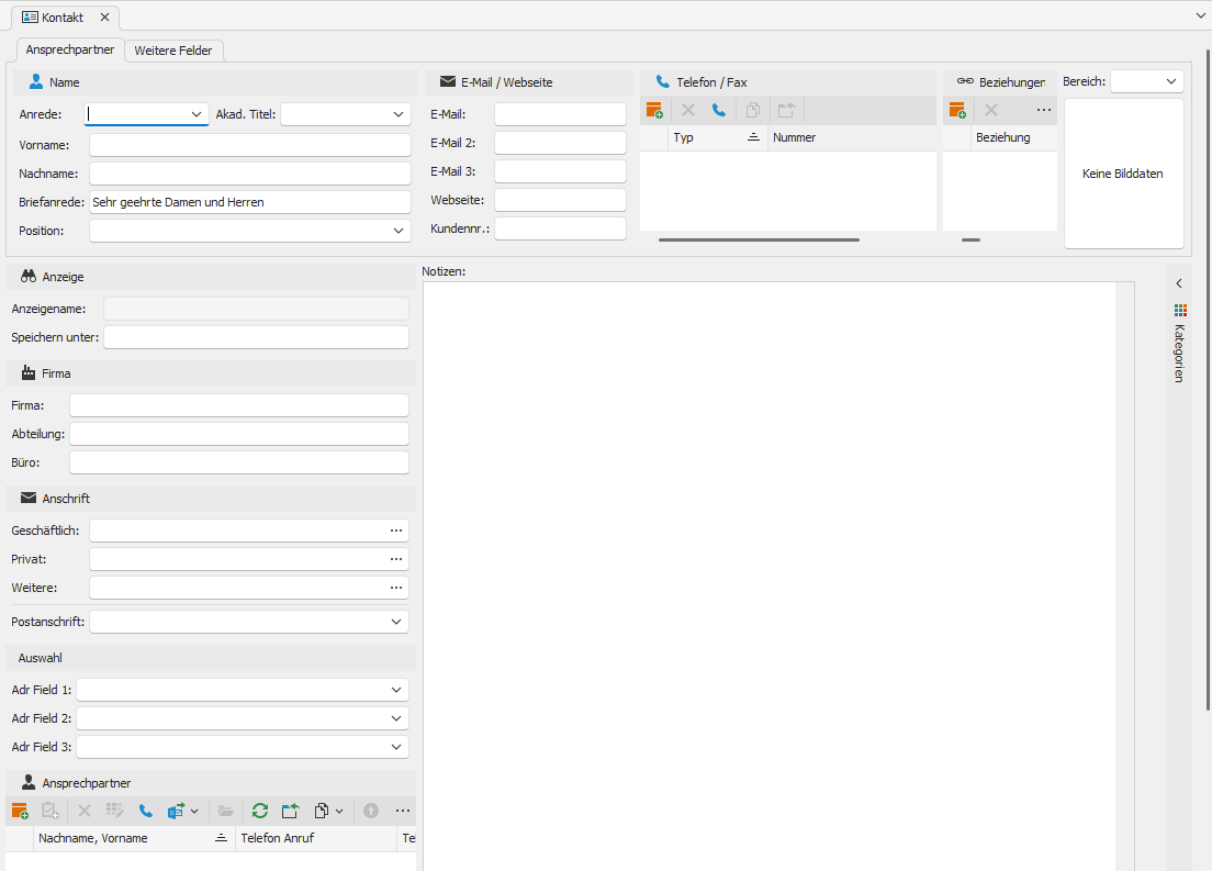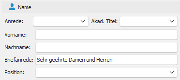 Die Felder Anrede, akademischer Titel und Position sind Felder, deren Werte sich aus Tabellen speisen, die in den Stammdaten unter “Kontakt” nach eigenen Vorstellungen füllen lassen.