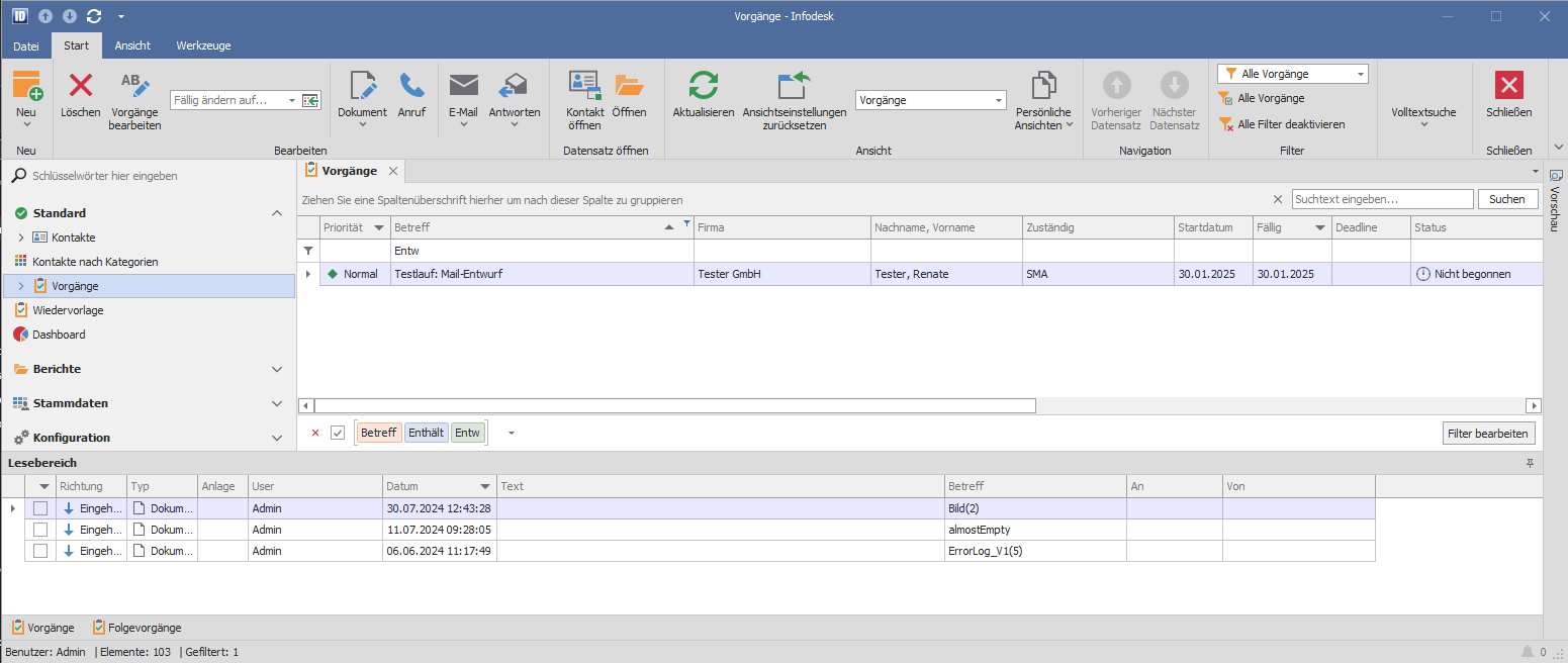 In der “Vorgänge”-Ansicht nutzt Infodesk die E-Mail- bzw. Fax-Adresse des im markierten Vorgang gespeicherten Kontaktes.